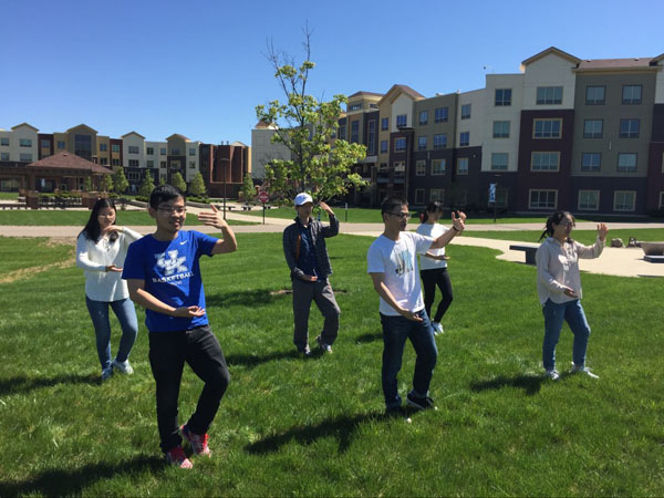 天气晴好的时候,同学们也会相约在公寓旁的草坪上合体锻炼,动作整齐划一,吸引了国际学生驻足欣赏,不少留学生还积极学习、共同参与,加入到练习太极拳的队伍中。
