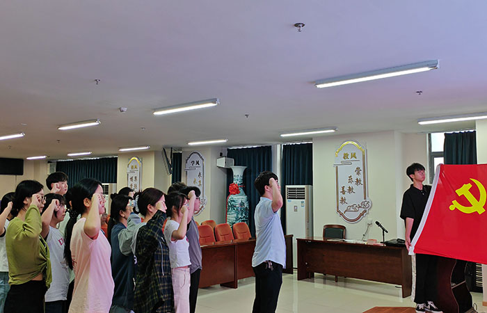 活动现场,庄严肃穆,全体起立,奏唱国歌。支部书记带领新发展党员面向党旗,庄严宣誓。
